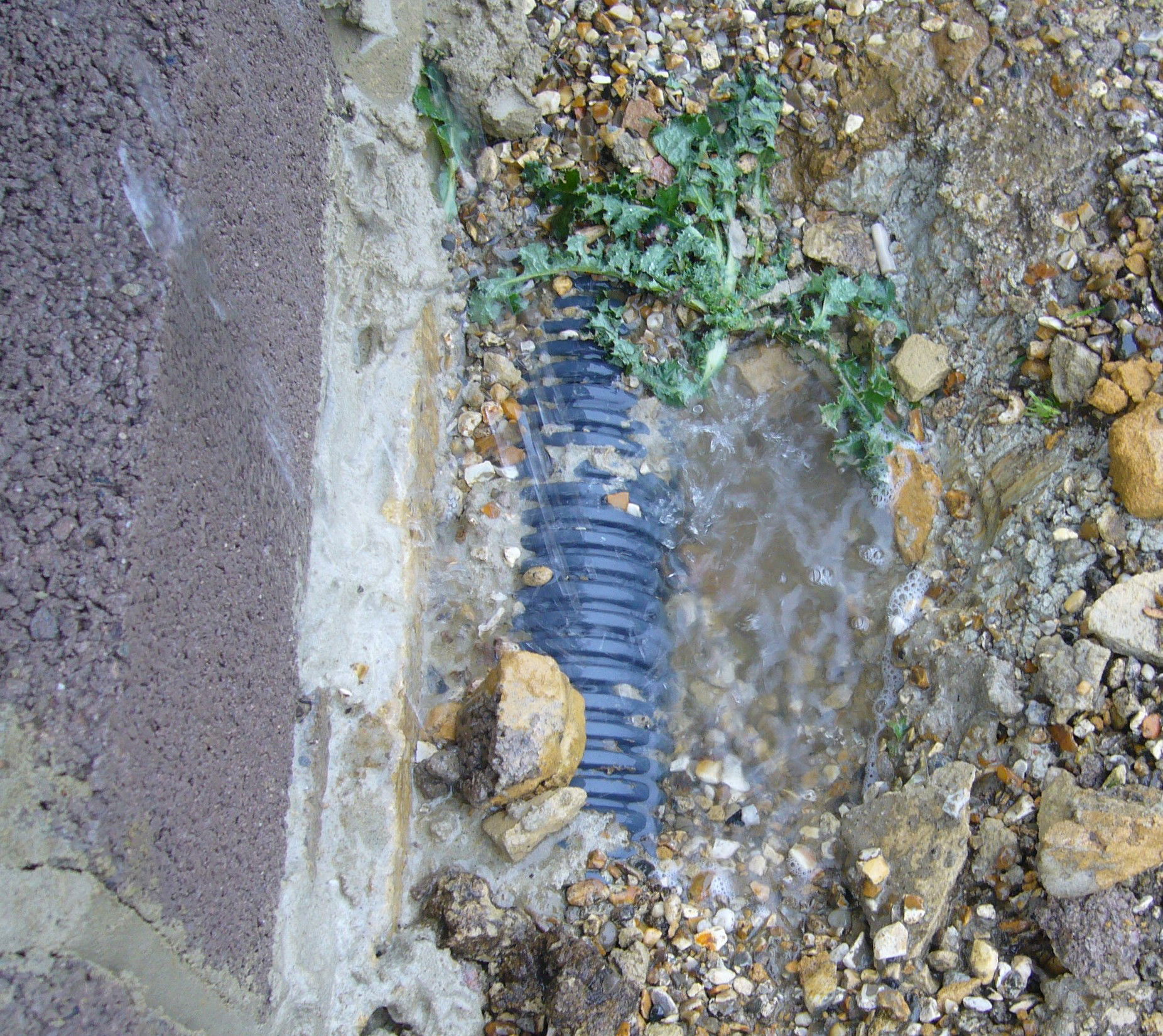 As an example the picture above shows a ground drainage pipe found next to the base of a park home. This pipe is perforated and is designed to be buried some 750mm deep and should be bedded onto and covered by a layer of shingle. Then the pipe requires connection to a means of drainage.